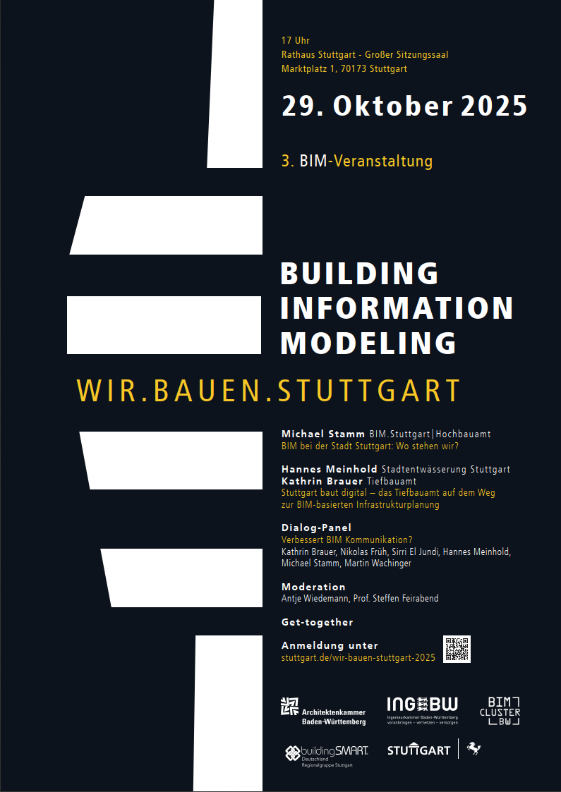 Auch im Oktober dieses Jahres möchte das BIM‐Cluster BW mit der Stadt Stuttgart, mit buildingSMART, der Architektenkammer BW und der Ingenieurkammer BW zusammen im Rahmen der Veranstaltungsreihe WIR.BAUEN.STUTTGART den Austausch zwischen Verwaltung und Privatwirtschaft zum Thema BIM fortsetzen.